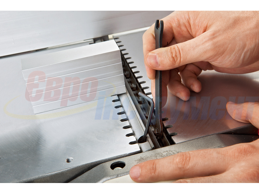На верхнем столе производят фугование или строгание под углом с использованием параллельного упора, который регулируется в диапазоне от 0 до 45°. Максимальная величина съема материала 3 мм. Для рейсмусования (калибрования деталей по толщине) предназначен нижний стол и устройство автоподачи заготовок. В данном случае максимальная глубина строгания за один проход составляет 2 мм.